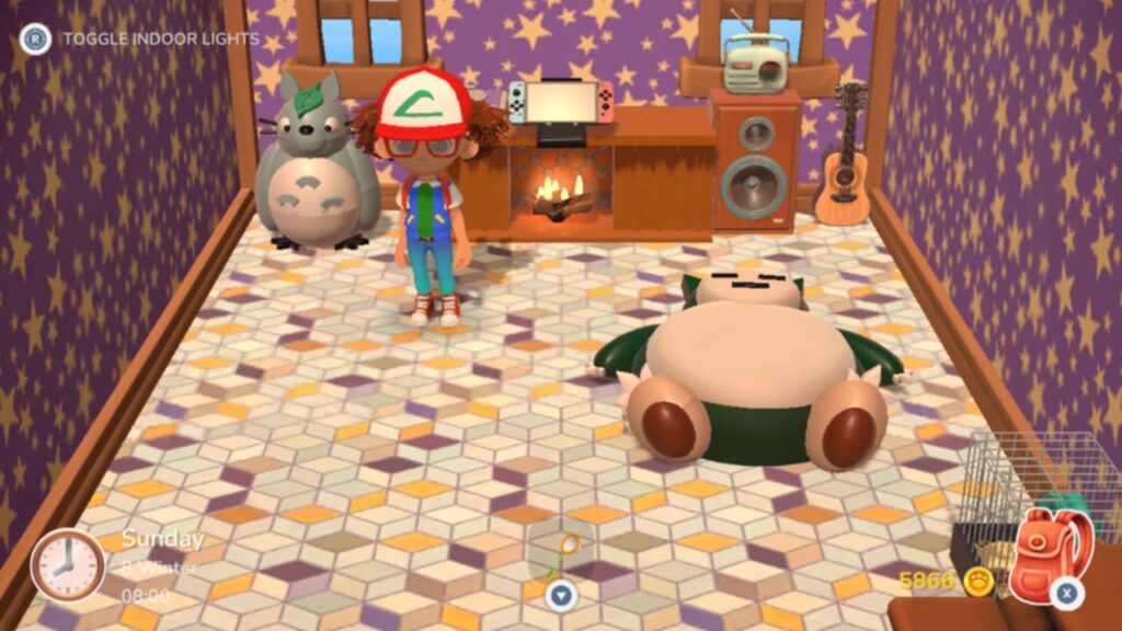 If you stick with it and take your time, the magic starts to unfold. That’s when things like Totoro statues happen. Or hot tubs beside rivers. Or glass bridges and hamster cages tucked into the back of town. Inside my house? A Snorlax bed. Because the magnificent thing about Hokko Life is that you can build whatever you want—so long as you have the patience and materials. And if you’re still learning or just want cool stuff without the grind, you can hop on the train (with Nintendo Switch Online) and visit a shop full of player-made creations. You can copy anything you like and have it sent straight to your mailbox.